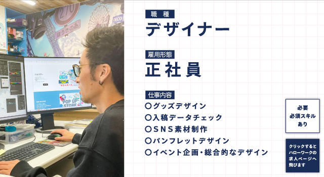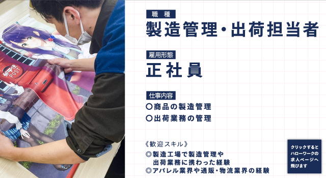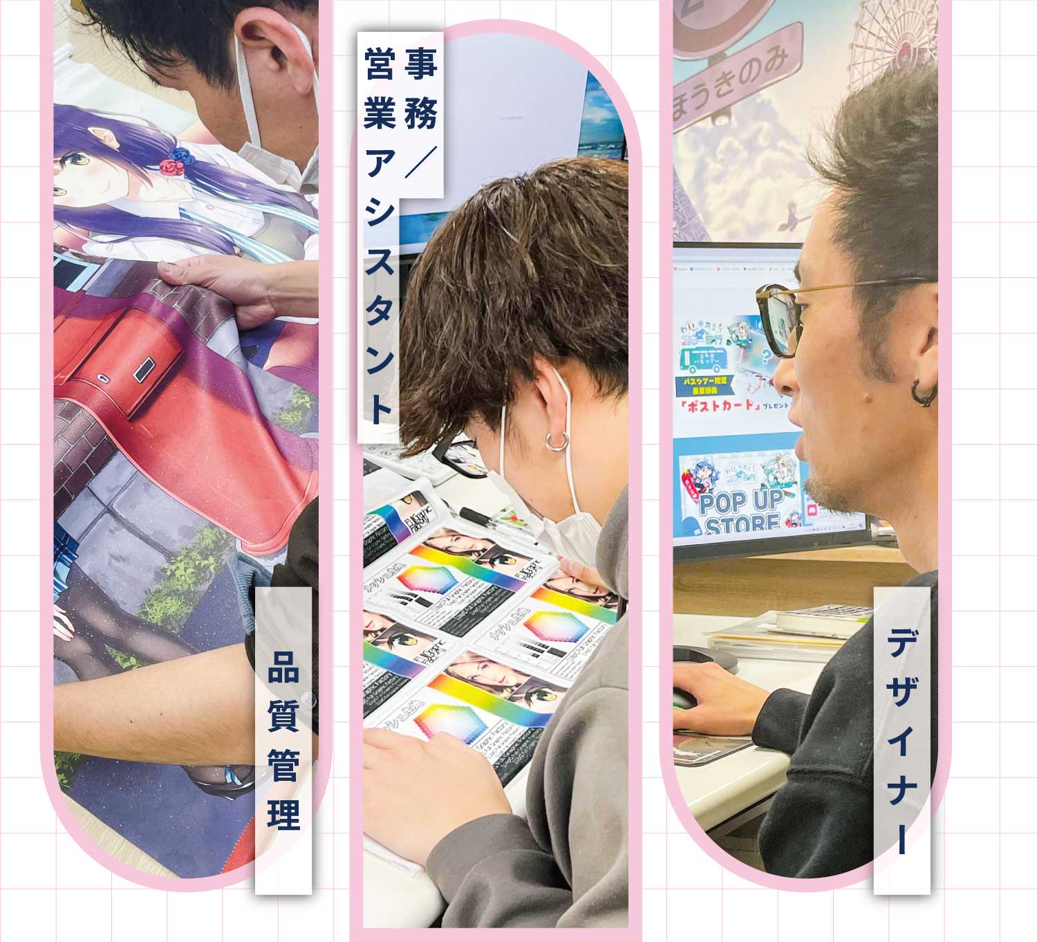 最新のアニメから往年の作品まで様々なコンテンツに関わり、今ではアーティストのライブグッズや企業や行政まで幅広い分野に携わっております。業界未経験でも大歓迎です。やる気と熱意があればできる仕事です。私たちと共に好きを仕事にして、世界中のファンを喜ばせられる、そんなクリエイティブな仕事をしていきましょう!