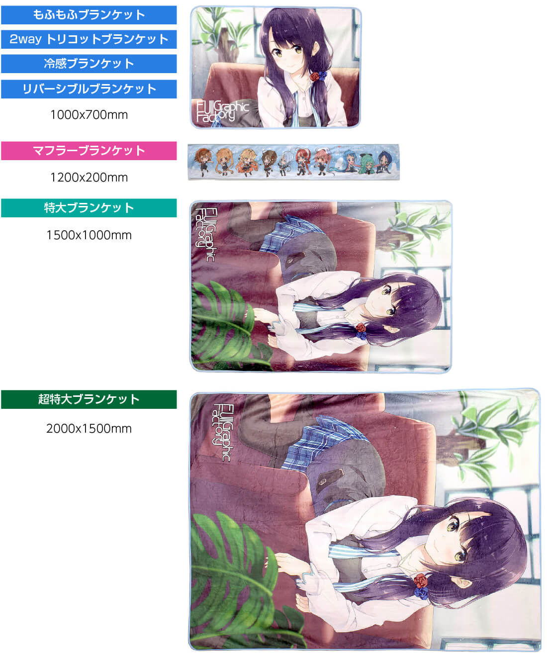 用途や商品化に応じて、多種のサイズを用意しており、オリジナルサイズのブランケットも製作できます。