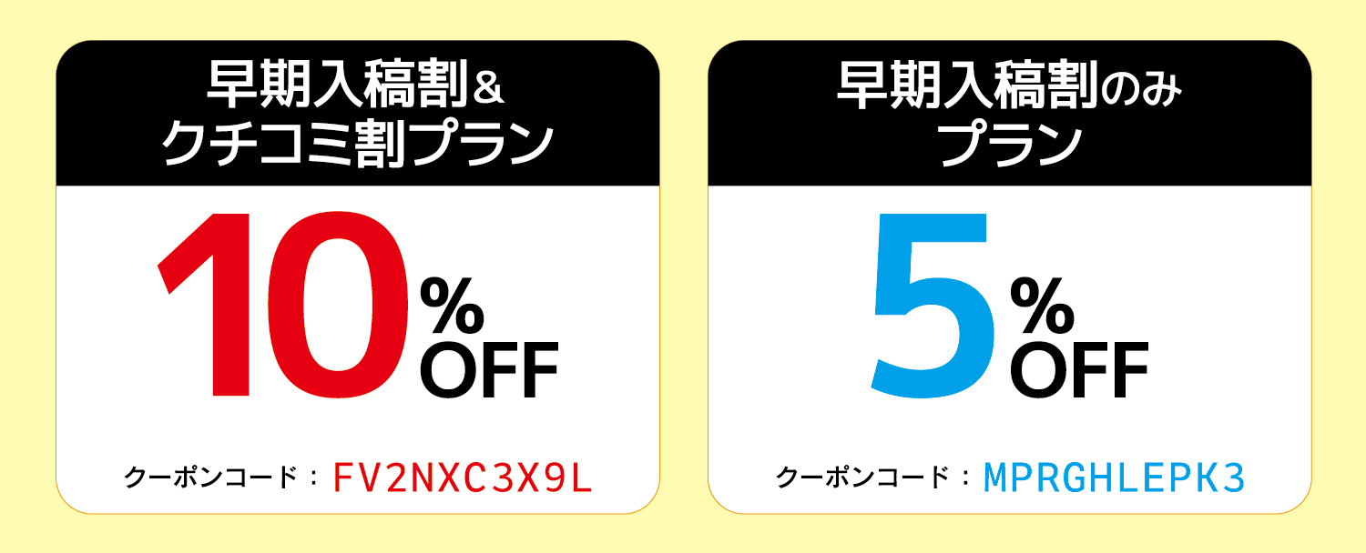 『早期入稿割引&クチコミ割』プラン  クーポンコード:FV2NXC3X9L