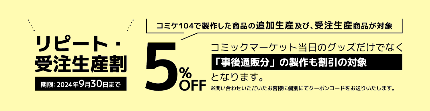 コミケ当日までにサンプル製作いただき、コミケで宣伝いただいた商品を受注生産する場合も割引の対象となります。
