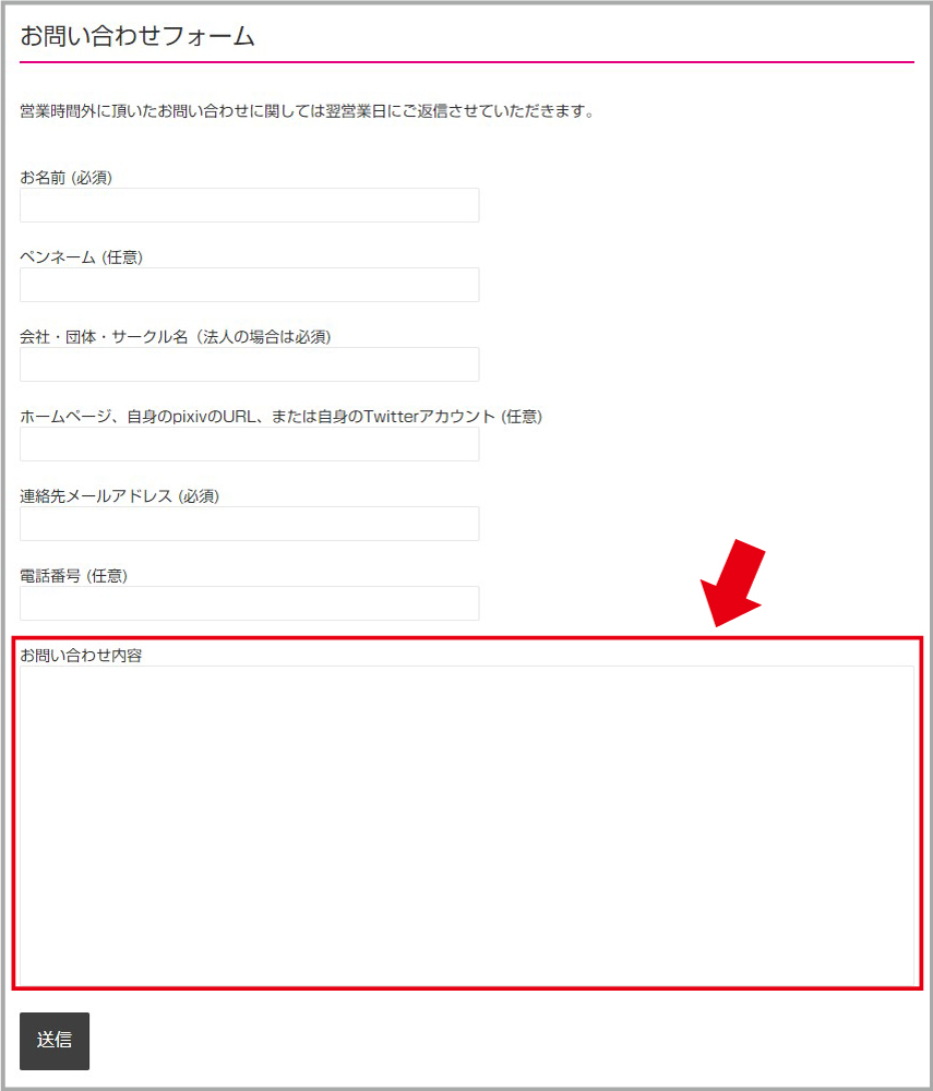 お客様情報をご記入のうえ、「お問い合わせ内容」欄に下記の内容をご入力ください。