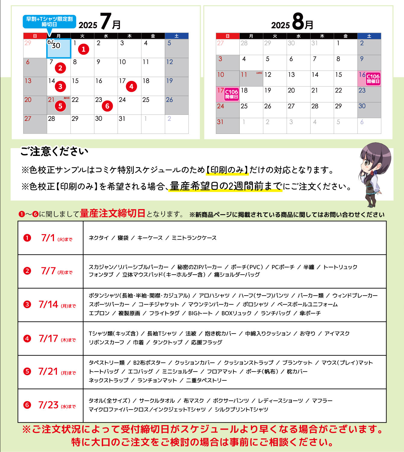 ※色校正サンプルはコミケ特別スケジュールのため(印刷のみ)だけの対応となります。色校正(印刷のみ)をご希望される場合、量産希望日の2週間前までにご注文ください。